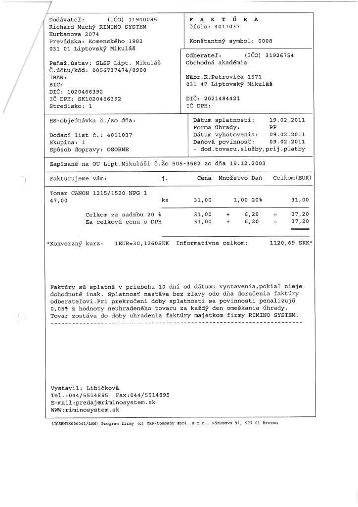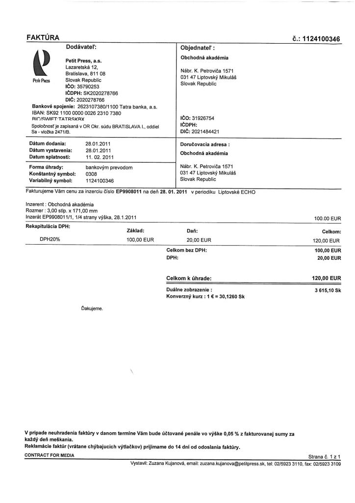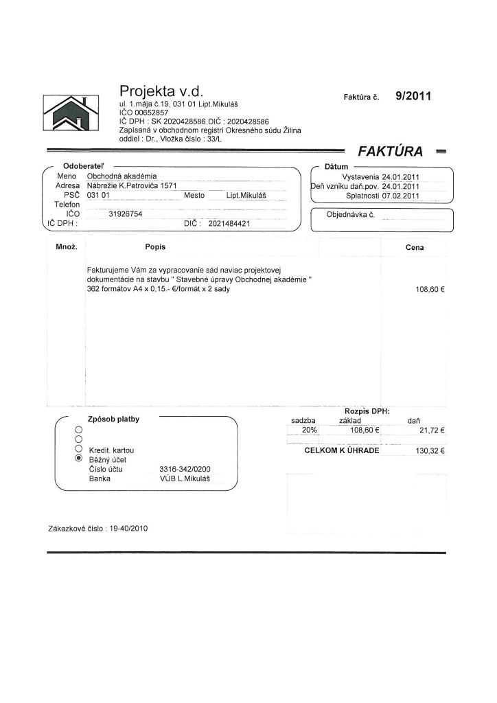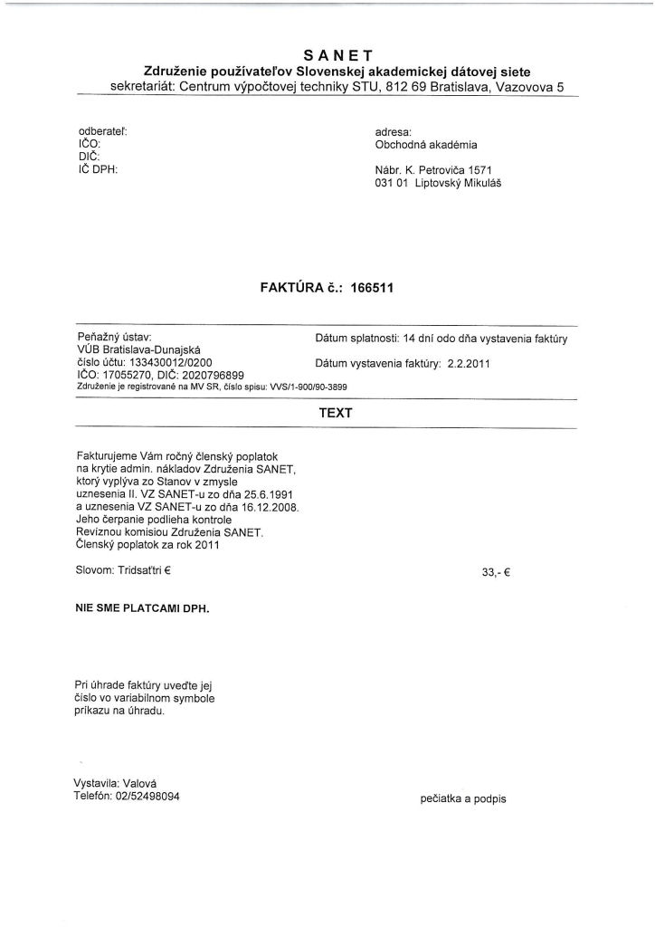 | Novela zákona o slobode informácií upravuje aj zverejňovanie faktúr a objednávok na tovary a služby. Naša škola je povinná v lehote 10 pracovných dní sprístupniť faktúru a objednávku na svojom webovom sídle. Pokiaľ však objednávka súvisí s povinne zverejňovanou zmluvou, škola nemá povinnosť takúto objednávku zverejniť. |
